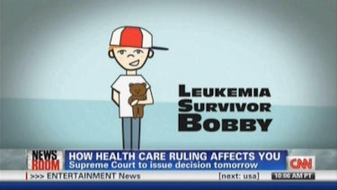 Cohen kicked off her report with "Leukemia Survivor Bobby" who would lose his coverage because of a preexisting condition. Anchor Don Lemon foolishly wondered if the hypothetical case would actually affect the Court's decision.