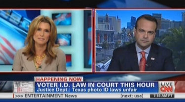Later on during the 1 p.m. hour, anchor Suzanne Malveaux teed up Ryan Haygood of the NAACP Legal Defense Fund to explain the "core issue" at stake. The NAACP has vowed to fight the new Texas voter ID law.