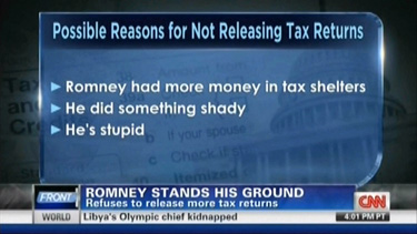 One of her hypothetical reasons that Romney was not releasing more tax returns was "he's stupid." Burnett quickly crossed that one off the list by professing that "Romney is not a stupid man." The "he's stupid" line did show up on the infographic for a couple of seconds however.