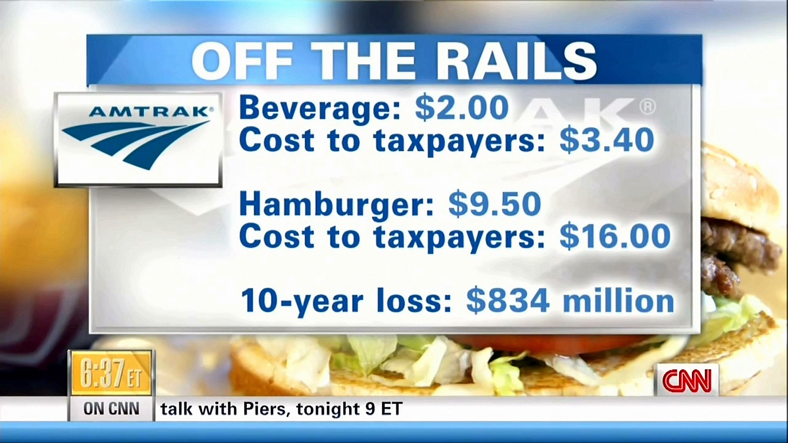 And here's why. Amtrak charges passengers $2 for a soft drink. But it cost the railroad about $3.40 to serve each beverage, that is when you add the labor cost. A hamburger goes for $9.50, but it costs Amtrak $16 for each one that they sell. Throw in up to $7 million a year in employee theft and Amtrak has cost taxpayers $834 million over the last decade.