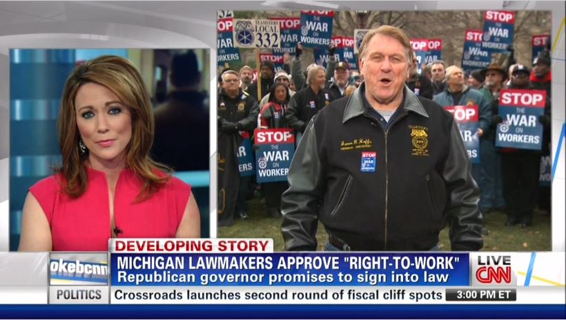 Teamsters Union president James Hoffa warned on CNN Tuesday that there would be "civil war" in Michigan over thepassage of right-to-work legislation, but after anchor Brooke Baldwin made two brief mentions of it the CNN blackout began. In contrast, on the next day Fox News hammered the "civil war" threat as an example of radical rhetoric.