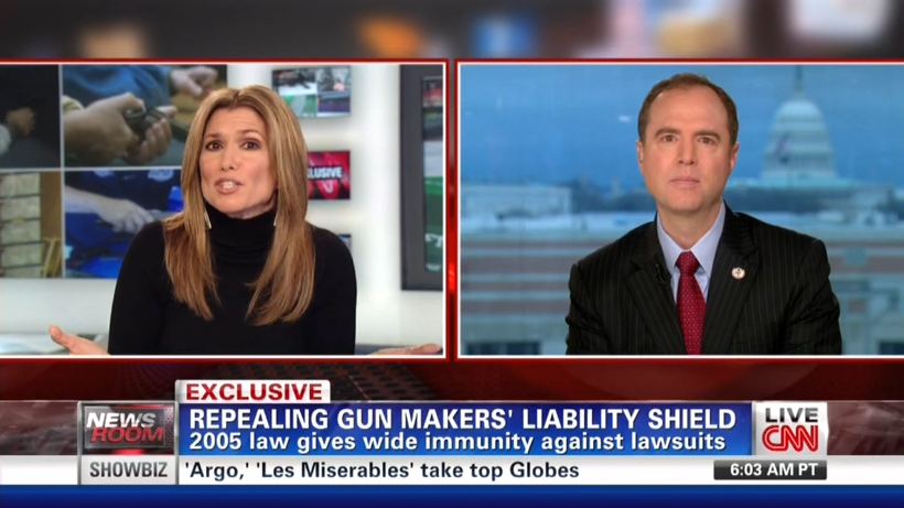 CNN's Carol Costello helped a Democratic congressman tout his new bill on Monday that allows victims of gun violence to sue the gun industry. Rep. Adam Schiff (D-Calif.) is aiming to repeal a 2005 bill passed by a Republican Congress that protected gun makers and dealers from such lawsuits.