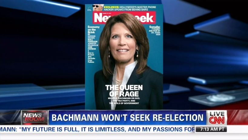 COSTELLO: Michele Bachmann, one-time Tea Party presidential candidate, is calling it quits. The Minnesota Congresswoman announcing overnight she will not run for a fifth term in Congress. Kind of surprising since Bachmann was once the face of big government rage. In fact, Newsweek tagged her "the Queen of Rage" in 2008.