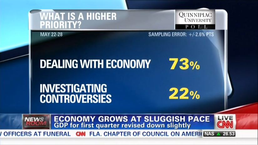 While a Quinnipiac poll showed 73 percent of voters deeming the economy a "higher priority" than "investigating" the scandals, 76 percent of voters still supported the appointment of a special prosecutor to investigate the IRS. However, CNN reported the news as if voters didn't even care about the IRS scandal.