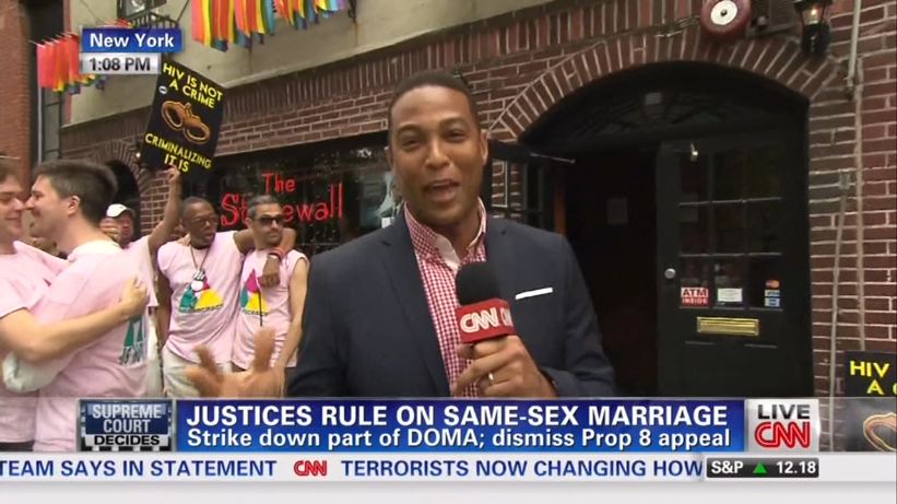 Openly-gay CNN anchor Don Lemon treated his viewers to live coverage of a gay "kiss-out" and gave them a tour of "iconic" gay bar Stonewall Inn in New York City, on Wednesday.
