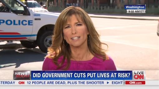 [UPDATED BELOW] Three times on Tuesday morning, CNN mentioned sequester cuts as a possible culprit behind the security breach at the Navy Yard that led to Monday's shooting there. A CNN headline actually read "Did Government Cuts Put Lives at Risk?"