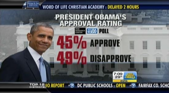 ABC chose the two polls with the lowest disapproval rating, the USA Today/Pew poll (49 percent disapproval) and the CBS News/New York Times poll (50 percent disapproval). It left out the NBC News/WSJ poll which had Obama at 54 percent disapproval, Bloomberg at 55, Quinnipiac at 57, and the Associated Press/GfK at 58.
