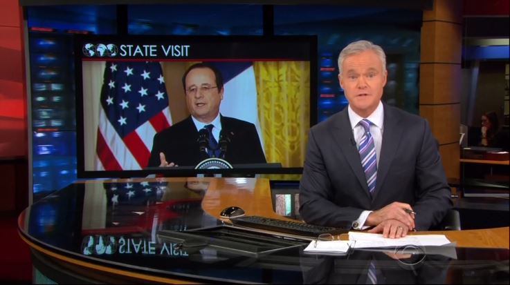 Reporting on Tuesday's White House state dinner featuring French president Francois Hollande, the CBS Evening News ignored the plummeting approval rating for his socialist policies.