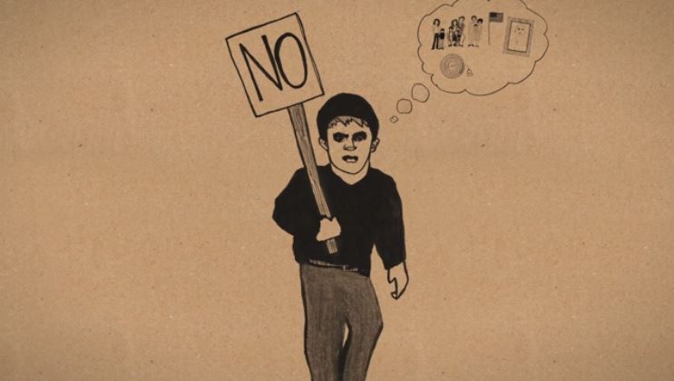 The visual shifts to a glowering man holding a sign that just reads “No” as the narrator intones, “But religious extremists oppose this. Citing freedom of religion, they claim that any organization should be able to discriminate against their employees, whether it's a church, a school, or even a business, like Taco Bell. Using bogus arguments about religious freedom to deny women birth control is just the tip of the iceberg.”