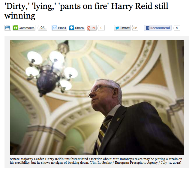 Politifact has set Harry Reid's pants on fire with the lie that Romney hasn't paid taxes in ten years. Even the Washington Post called out Reid's paranoid rants about Romney, labeling his statements as baseless drivel. However, the L.A. Times seems to think this whole sordid episode is scoring points for Obama.
