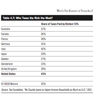 the United States is actually more dependent on rich people to pay taxes than even many of the more socialized economies of Europe. According to the Tax Foundation, the United States gets 45 percent of its total taxes from the top 10 percent of tax filers, whereas the international average in industrialized nations is 32 percent. America’s rich carry a larger share of the tax burden than do the rich in Belgium (25 percent), Germany (31 percent), France (28 percent), and even Sweden (27 percent).