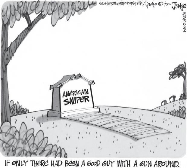 Today, our friends at Twitchy reported that Lee Judge, a left-wing political cartoonist, illustrated a depraved caricature depicting the grave of ex-sniper, and Navy SEAL, Chris Kyle – with the caption “if only there had been a good guy around.”  This is wholly insensitive, and a craven attempt to smear an American hero who was tragically slain by a fellow veteran whom he was helping cope with PTSD.