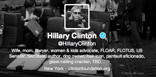 Her profile picture is a TIME photo by Diana Walker of the then-Secretary of State checking her blackberry aboard a military C-17, on her way to meet with Libyan rebel leaders in Tripoli. The photo was made famous by the Tumblr “Texts from Hillary.”