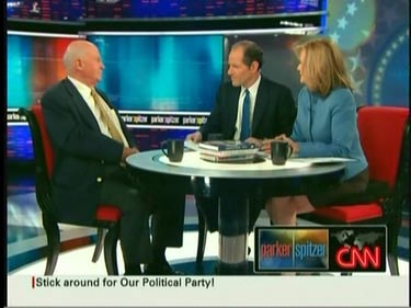 Throughout the first half of the 11-minute segment , which began 15 minutes into the 8 pm Eastern hour, Spitzer actually more vigorously defended his co-host than she defended herself. Later, Viguerie stated that "CNN says they play it down the middle. Nobody that I know- literally no one in the Republican, conservative, right-of-center community sees CNN as playing it down the middle. We see it as- you know, left of center." Parker merely replied, "Well, they hired me to balance that out." On the other hand, the former New York governor of "Client Number Nine" infamy chimed in that "Kathleen is not only not plain vanilla- she is acerbic, she's smart, and she- her critiques are devastating, but we'll get to that over the course of this show."