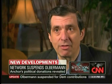 Later, after recounting how the MSNBC personality has been "a vocal critic of Fox and its parent company, News Corp, for donating $1 million to the Republican Governors Association," the CNN correspondent played her clip from Kurtz, who gave his take on the Olbermann suspension and on the Fox News contributors' fundraising: