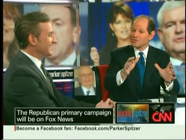 On Tuesday's Parker-Spitzer on CNN, ex-Governor Eliot Spitzer ironically worried that too many of his fellow former politicians, who are also contenders for the 2012 Republican presidential nomination, are on Fox News: "Never before in our history...has one media outlet with one coherent ideology had almost a monopoly on...half of the presidential nominees and controlled one political party this way."