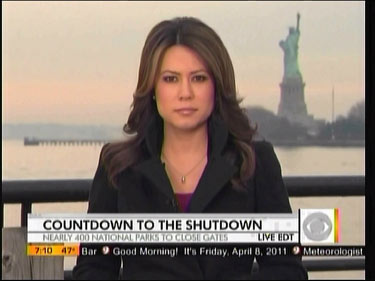 Betty Nguyen, CBS News Correspondent | NewsBusters.orgNGUYEN: The Statue of Liberty is just one national monument that would close if the government does shut down. Now, let me put this in perspective for you: 10,000 people visit her every single day- that is 5 million people each year- and she is just one of many of the different national parks in the system. There are 394 national parks across the country. In April, some 800,000 visitors will spend $32 million a day at these parks. Now, that's money that would be lost from local economies across the country. Even more bad news: nearly 20,000 park employees would be sent home.