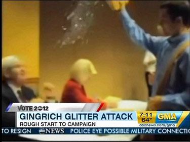 Screen cap from 18 May 2011 edition of ABC's Good Morning America of glitter attack on Newt Gingrich | NewsBusters.orgUnlike the other two networks, ABC's Good Morning America didn't highlight the protest at the top of the program. However, correspondent Jake Tapper omitted the left-of-center cause of the glitter-tosser during his report 11 minutes into the 7 am Eastern hour: "It has been a difficult, and at times, just plain weird presidential campaign launch for former House Speaker Newt Gingrich, shown here last night in Minnesota being assailed with glitter by a protester."
