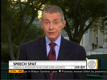 CBS's Bill Plante hyped the supposedly "testy confrontation" between President Obama and Speaker Boehner on Thursday's Early Show over scheduling a presidential address to Congress: "This may prove that there is no argument too petty in today's Washington." By contrast, on Wednesday's CBS Evening News, Norah O'Donnell placed more blame on Obama for giving Boehner only a "15-minute heads-up."