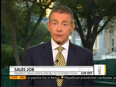 Plante led the 7 am Eastern hour with his report on the President's legislation, and mentioned the Republicans only in passing: "He's [Obama] been saying that both Republicans and Democrats support the kinds of ideas that he's got in this job bill. But he knows that Republicans are reluctant to embrace the kind of spending he wants. So, he's taking his case directly to the voters, as he did Friday in Richmond, Virginia."