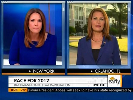 The anchor raised the immigration issue towards the end of her interview of the Minnesota representative. Hill first quoted Gov. Perry's line on the in-state tuition issue from the previous night's debate: "He said, 'If you say we should not educate children who come into our state by no fault of their own, I don't think you have a heart.'" She then made a budget-based appeal to the Republican: "I know you said you don't want any resources to go to illegal aliens or their children. Why not, though, give them a tuition break now, rather then, perhaps, down the line, having to hand over unemployment, or even welfare?"