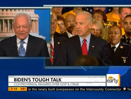 Despite correspondent Bill Plante's full report on Biden's attack on the GOP, which included a sound bite of the Democrat standing by his comments after a question from Human Events editor Jason Mattera, Face The Nation host Bob Schieffer all but defended the Vice President's remarks: "I think the Vice President is just drawing things in the starkest possible terms...it is a little bit difficult to argue with the logic. If you have fewer police on the streets, you're probably going to have more crime."