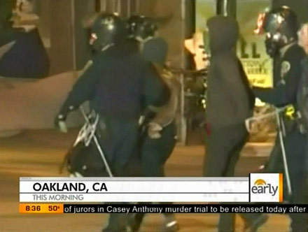 The morning shows of ABC, CBS, and NBC on Tuesday devoted just 19 seconds to the arrests of 75 people in northern California, after police evicted Occupy Oakland from their encampment in front of city hall there. The Early Show devoted a news brief to the story during its last half hour, noting the violent reaction from some of the protesters. Good Morning America and the Today show both punted.