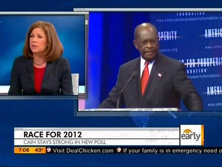 The correspondent noted the right-leaning argument in response to a statement from anchor Erica Hill about a recent ABC News/Washington Post poll that had Cain just barely behind Mitt Romney at the front of the GOP presidential pack: "It would seem these allegations didn't have much of an impact in the latest polling." Just prior to this, the morning show played a sound bite of Cain refusing to answer a reporter's question on the controversy at a weekend press conference.