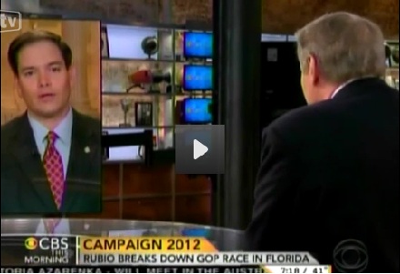 The Florida Republican continued by trying to cite the chief executive's use of class warfare as a tactic "What about the part that basically implies...that the only way that some people in America can be better off is for other people to be worse off? And that's not true to our heritage." The CBS anchor, however, cut the potential vice presidential candidate short just 11 seconds after he began his answer, in an apparent rush to get to the local weather reports [audio clip available here; video below the jump].