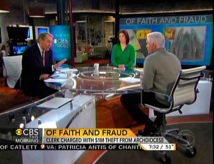 [CBS News Graphic: "Of Faith And Fraud: Clerk Charged With $1M Theft From Archdiocese"]