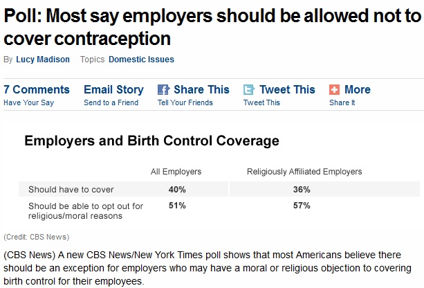 Writer Lucy Madison explained in the Tuesday CBSNews.com article, "Poll: Most say employers should be allowed not to cover contraception," that "most Americans believe there should be an exception for employers who may have a moral or religious objection to covering birth control for their employees....When asked specifically about religiously-affiliated employers, 57 percent of Americans said they should be able to opt out of the mandate if they have religious or moral objections. Thirty-six percent said such organizations should have to cover birth control."