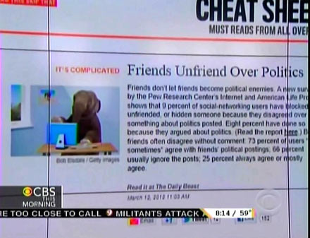 CBS This Morning on Tuesday highlighted a recent Pew Research poll that "says politics is now making the Internet very unfriendly....nine percent of social networking users say they've un-friend...or blocked someone whose politics they disagree with." But the morning show failed to mention that the poll explained that "liberals are the most likely...to block, unfriend, or hide."