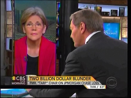 On Monday's CBS This Morning, Charlie Rose and Erica Hill touted Massachusetts Democrat Elizabeth Warren's past time as "the government's chief watchdog during the 2008 bank bailout" as she was brought on to discuss JP Morgan Chase's $2 billion loss. Rose and Hill asked all of their questions from the left, and completely ommited any mention of the recent controversy over Warren's claim of Native American ancestry.