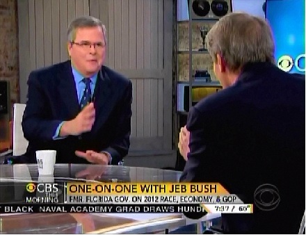 Later in the segment, the CBS anchor and the former governor had an extended exchange about the differences between him and Mitt Romney and the other would-be Republican presidential candidates on the issues of the budget and the taxes. Rose hinted that Bush was the one reasonable one in the group: