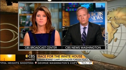 [CBS News Graphic: "Race For The White House: Obama-Romney Camps Clash Over Foreign Policy"]
