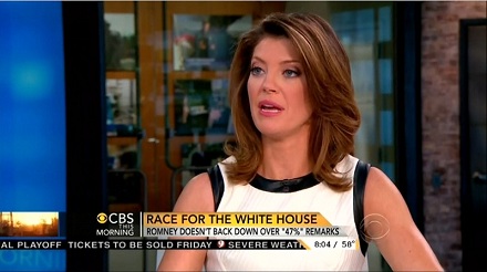 Instead of reporting these figures during the earlier segment with Schieffer, the anchor helped the Face the Nation host paint a dark outlook for Romney: "Karl Rove, who is involved in a super PAC that helps fund campaign ads that support Mitt Romney's election – I mean, even he said Americans who don't pay income taxes are part of the GOP coalition. So there – it's not just pundits and columnists. You have strategists, like Karl Rove, who suggested this is a problem."