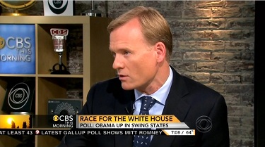 The CBS political director raised no such objections back in mid-September, when the morning newscast spotlighted the same poll at a point where the two candidates were in a statistical dead heat, with Obama slightly ahead among both registered voters and swing state voters.