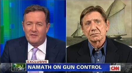 Football Hall of Famer Joe Namath called out NBC's Bob Costas on Monday's Piers Morgan Tonight for gratuitously inserting his pro-gun control views into a NFL telecast: "As a football fan, I'm not up to that kind of a halftime take. There is a time and a place for it, and I wasn't pleased about that."