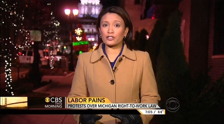 Tuesday's CBS This Morning played up the union-led protests against a proposed right-to-work law in Michigan. Elaine Quijano claimed "the protests here in Michigan...[will] likely only get bigger." Quijano added that "they're planning to return today in record numbers - protesters determined to defend one of the biggest union strongholds in the country."