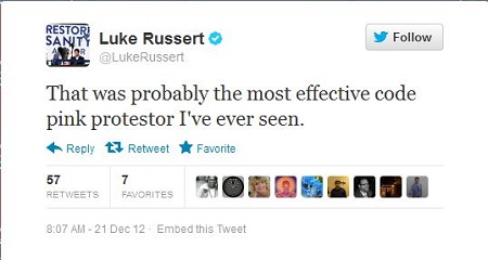 NBC News correspondent Luke Russert marveled at Code Pink's disruption of the National Rifle Association's press conference in a Friday post on Twitter: "That was probably the most effective code pink protestor I've ever seen."