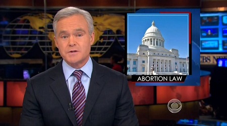 On Wednesday and Thursday, two of the Big Three networks ballyhooed how the Arkansas state legislature overrode Governor Mike Beebe's veto of a pro-life bill that outlaws abortion once the unborn baby's heartbeat is detected. Scott Pelley hyped "the most restrictive abortion law in the country" on Wednesday's CBS Evening News, echoing the New York Times' label of the new law – "the country's most restrictive ban on abortion".