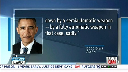 President Obama's "fully-automatic weapon" line did receive some coverage outside of these broadcast outlets. On Thursday, CNN's Jake Tapper reported on the President's false claim on his program, The Lead, and when he acted as a substitute host on colleague Erin Burnett's show, OutFront. The former ABC correspondent took the President to task for the line: "It might help the advocates of gun control if, in their advocacy for stricter measures, they seemed more familiar with what exactly they're trying to ban."