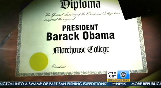 By contrast, fill-in anchor Jim Axelrod gave a 35-second news brief on the President's Morehouse speech on Sunday's CBS Evening News. Sunday's World News on ABC set aside 42 seconds in wider report about commencement addresses to the Democrat's speech, but also mentioned First Lady Michelle Obama's address to a high school graduation ceremony in Nashville.