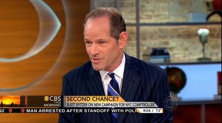 The CBS morning show anchors, along with their colleagues at ABC's Good Morning America, failed to verbally identify their guest as a Democrat during the segment. An on-screen graphic only briefly pointed out Spitzer's party identification. Back in 2008, when the prostitution scandal first broke, the network, along with its Big Three competitors, took their time in explicitly mentioning the then-governor's Democratic affiliation.