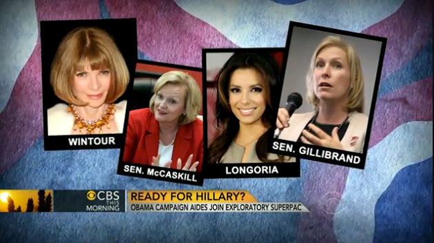 The correspondent first outlined that the former secretary of state's public activities "continue to fuel speculation that a White House run in 2016 looks like a go, as do prominent endorsements from politicians and celebrities." The on-screen graphic underlined the endorsements by displaying the pictures of four noteworthy Clinton supporters: Vogue magazine's Anna Wintour, Missouri Senator Clare McCaskill, actress Eva Longoria, and New York Senator Kirsten Gillibrand.