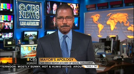[CBS News Graphic: "San Diego Scandal: Mayor Denies Sexual Harassment Charges"]