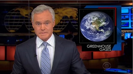 The CBS journalist then summarized the report's findings – that "CO2 levels have continued the steady rise that began in 1958 at 315 parts per million; reaching 394 parts per million last month. High levels of carbon dioxide can create a warming blanket around the Earth. The U.N. says the gas is responsible for 80 percent of the warming effect on the planet's climate."