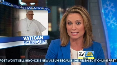 Robach's news brief is in the same vein as Time magazine's recent Person of the Year cover story about the Bishop of the Rome, where writers Howard Chua-Eoan and Elizabeth Dias. Chua-Eoan and Dias contended that supposedly, "in a matter of months, Francis has elevated the healing mission of the church...above the doctrinal police work so important to his recent predecessors."