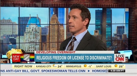 CNN's Chris Cuomo made no secret of his support of left-wing LGBT activists on Monday's New Day, as he spotlighted the controversy over a proposed bill in Arizona that would protect the religious liberties of business owners. Cuomo berated a guest from the conservative lawyer for her defense of the bill: "You don't need even need this law unless what you want to do is enforce intolerance...That's what it seems like you are doing to me, and it seems pretty obvious."