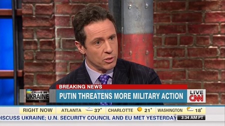 CNN's Chris Cuomo ran to President Obama's defense on Tuesday's New Day, after former Senator Jim DeMint criticized the White House's handling of Russia's invasion of Ukraine: "Isn't the notion that only might can make right tired? The American people do not have appetite for more military action, and everyone is condemning Putin...Isn't this proof that President Obama's tactic of let's try to talk; let's try to be flexible – not everything is about having the biggest muscles – may be the way the world wants to proceed?"